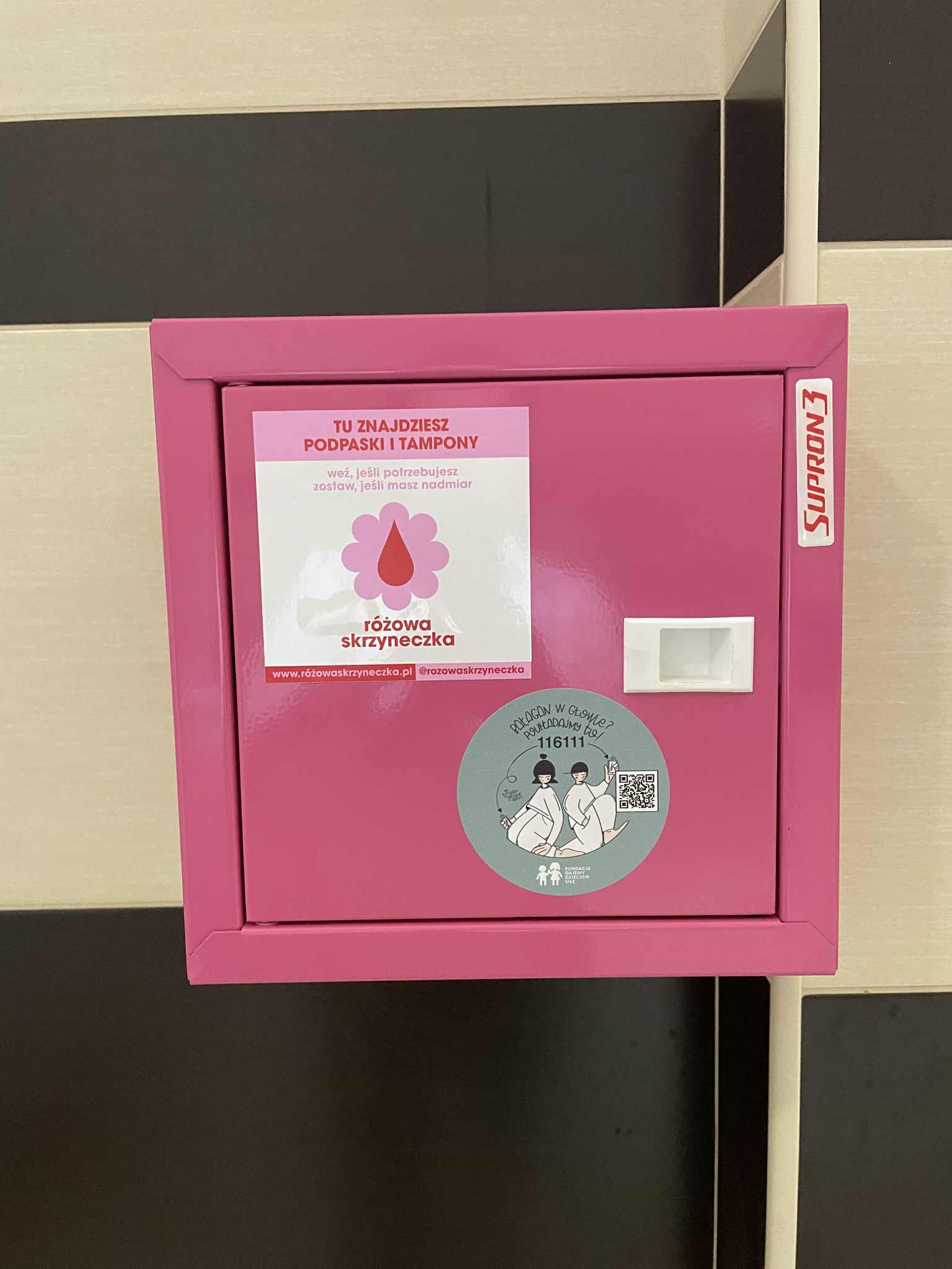 W ostatnich dniach w naszej szkole zamontowano w damskiej łazience różowe skrzyneczki. Znajdują się w nich produkty higieniczne, takie jak podpaski czy tampony. Dziewczynki mogą z nich korzystać, jeśli mają taka potrzebę, lub zostawić, jeśli mają nadmiar środków higienicznych. Jest to pomysł zrealizowany przez Samorząd Uczniowski, w celu zapewnienia naszym uczennicom poczucia komfortu podczas miesiączkowania.