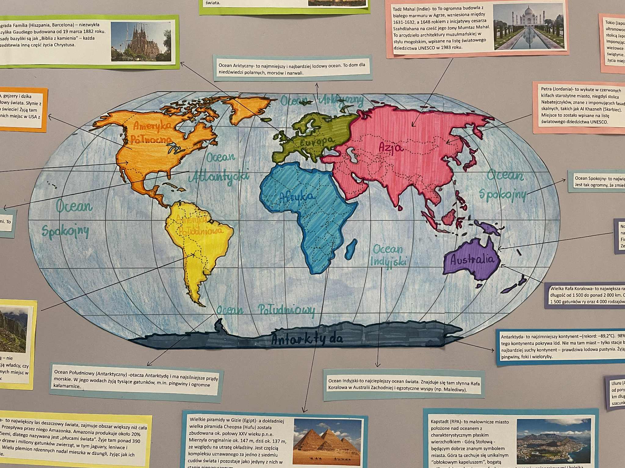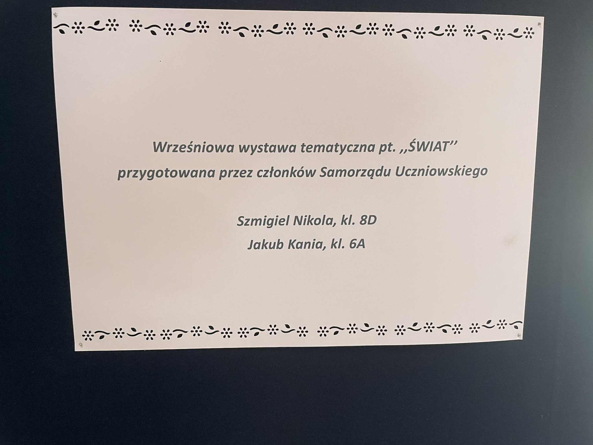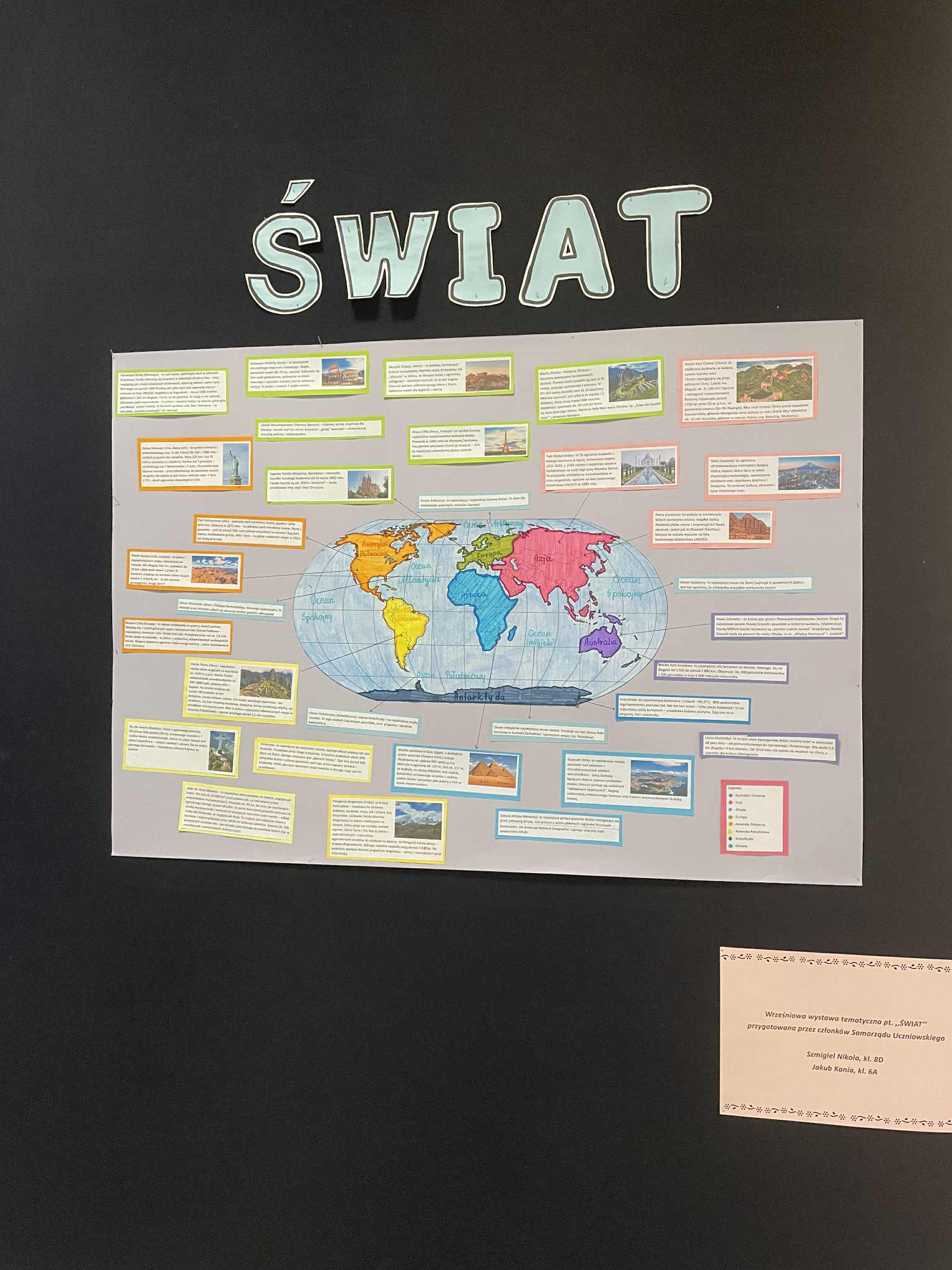 W dniu 10 września 2025 r. członkowie Samorządu Uczniowskiego stworzyli wystawę tematyczną „Świat’’. Dzięki niej uczniowie naszej szkoły mogli przeczytać informacje o zabytkach, kontynentach oraz oceanach na naszej planecie.